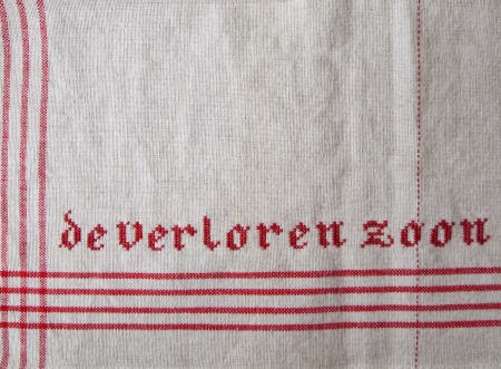 Natuurlijk: 'De verloren zoon' in keurige oude lettertjes uit een van de alfabetten die op Marken gebruikt worden.