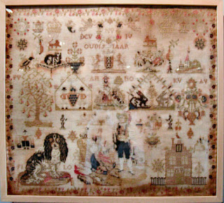het werd in 1920 in Weesp gemaakt door Mia Wouters. Het is een gevarieerd en uitgebreid lapje met behalve de letters om te leren merken ook een tweetal stopjes en wat hoekjes en randjes.